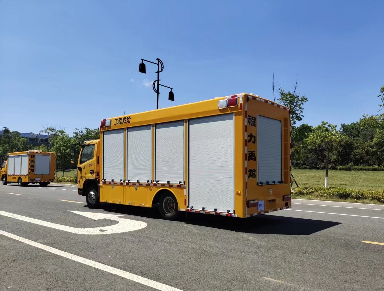 | 上裝配置 | 1、廂體外形尺寸根據(jù)實(shí)際公告標(biāo)準(zhǔn)。 廂體:具備運(yùn)輸、防雨、防火、阻燃、防塵、防銹、降燥,隔震、長(zhǎng)期抗震結(jié)構(gòu)。外部鋼材為優(yōu)質(zhì)冷軋鋼板,表面處理平整,內(nèi)襯優(yōu)質(zhì)冷軋鋼板折彎骨架,強(qiáng)度牢固,配重合理。 2、廂體一體化鋼體結(jié)構(gòu)設(shè)計(jì), 頂部平坦。廂體采用骨架式夾層形式,外蒙皮采用厚1.5mm優(yōu)質(zhì)防銹處理的汽車專用冷軋鋼板,中間骨架采用防銹處理后的鋼管焊接,頂層、側(cè)圍內(nèi)、外層之間填充長(zhǎng)時(shí)間使用對(duì)人體無害的防火阻燃環(huán)保吸音棉,外層鋪蓋一層阻燃金屬布,內(nèi)飾采用0.8mm厚網(wǎng)孔板。底板采用鋼結(jié)構(gòu)底框架,上表面鋪厚2mm花紋鋼板。 3、車輛廂體采用整體包覆式,廂體兩側(cè)下部設(shè)置裙邊式,全封閉式結(jié)構(gòu),頂部為圓弧型,尾部有轉(zhuǎn)向燈、剎車燈、尾燈、霧燈,箱體表面光滑平整。車廂靠駕駛室前部為休息室,休息室內(nèi)帶折疊坐椅及折疊桌,往后為機(jī)組室,機(jī)組室左、右側(cè)布置進(jìn)排風(fēng)百窗,設(shè)置機(jī)組檢修門一個(gè),下置登車踏步梯,車廂后端為后為卷簾門。右側(cè)排風(fēng)百葉窗下部為維修觀察艙門。左側(cè)下圍設(shè)置有工具箱及功能艙門等。右側(cè)下圍設(shè)置有汽車油箱艙、液壓控制艙等。 4、車廂尾部配置標(biāo)準(zhǔn)儲(chǔ)物貨架讓出水帶、加長(zhǎng)電纜等附件存放有序、互不干涉,讓緊急排水搶險(xiǎn)變得更加快捷、有效。 5、廂體噴漆:工程黃,與車頭同一顏色; 6、最終的門數(shù),形式,打開方式嚴(yán)格按照合同要求依據(jù)程力公告生產(chǎn); | ||
