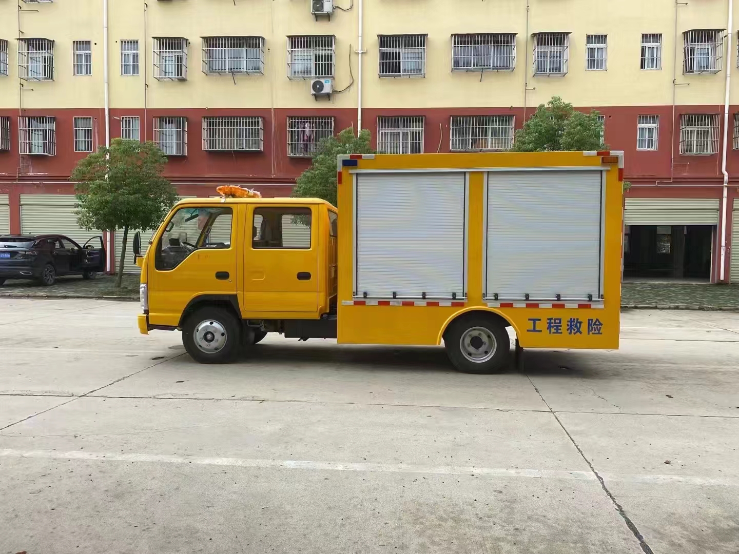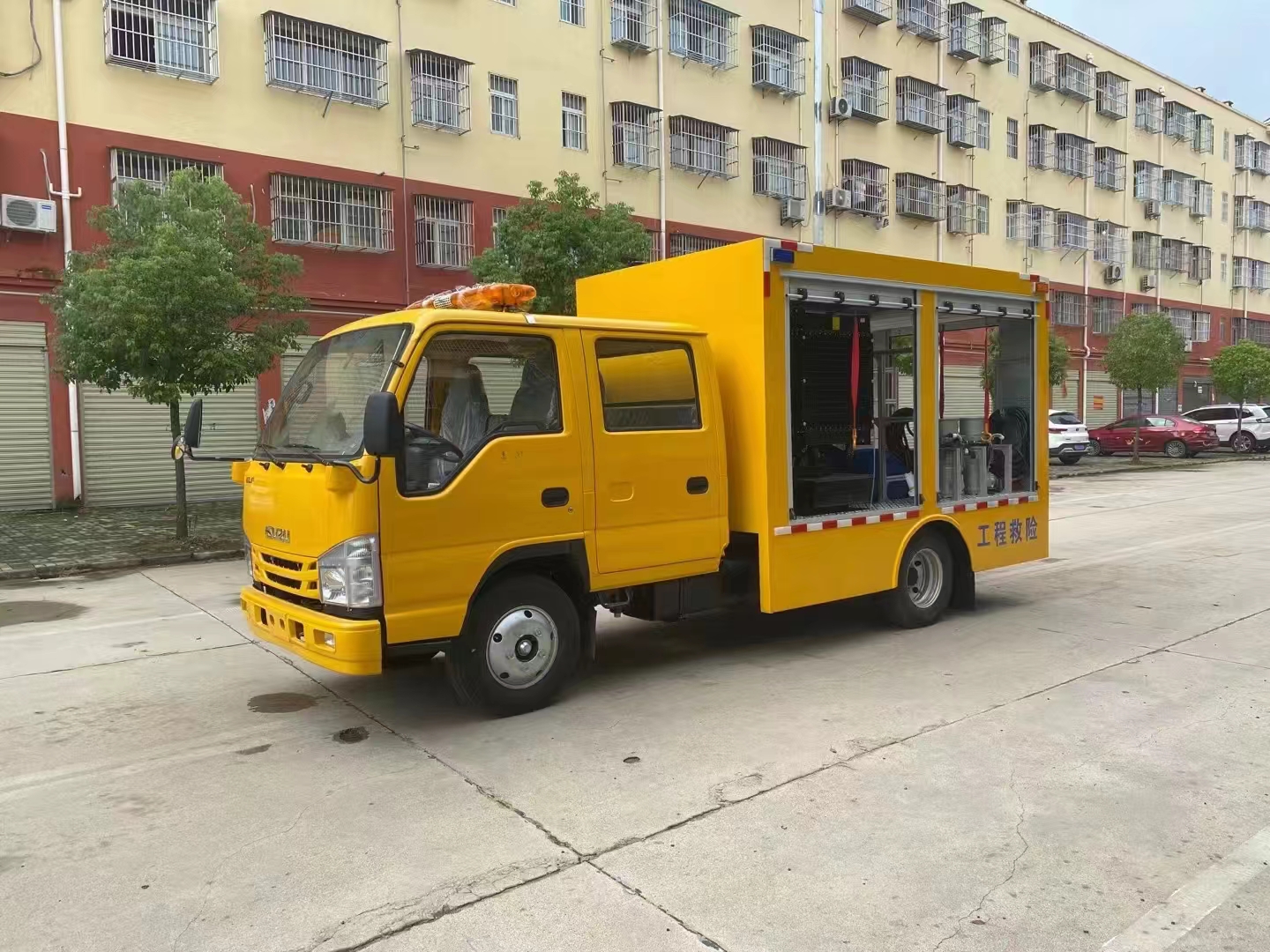 | 上裝配置 | 車箱一體式全封閉車箱車箱有隔音功能,廂體防火,阻燃,防雨,防塵,防銹,降噪,隔震,長期抗震結構,廂體外觀按照公告外觀制作,左右卷簾門,尾部是卷簾門,廂內(nèi)安裝LED作業(yè)燈,作業(yè)燈帶獨立開關,底板采用花紋板。配備康明斯50KW發(fā)電機組,2臺功率22KW便攜式超輕型高速潛水泵,單臺水泵流量可達500m³/h,單泵配40米排水管(20米/根),水管直徑 DN200mm,水管材質(zhì)為滌綸長絲編織。配有升降照明燈,升降燈可通過無線和有線遙控兩種方式控制,升降燈升降高度為1.2米,可水平旋轉。帶接地樁和接地電纜線,便攜泵控制柜,潛水泵浮圈,長排警燈,倒車影像,配兩只手提式干粉滅火器2只。其余為標配… | ||